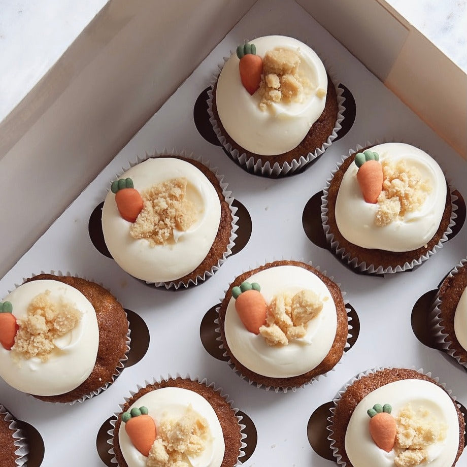 Butter, free-range eggs, flour, dark sugar, pure corn oil, fresh carrots, baking powder, baking soda,  icing sugar, cream cheese, pure vanilla, shortbread biscuits, mini carrot sugar decoration (optional)