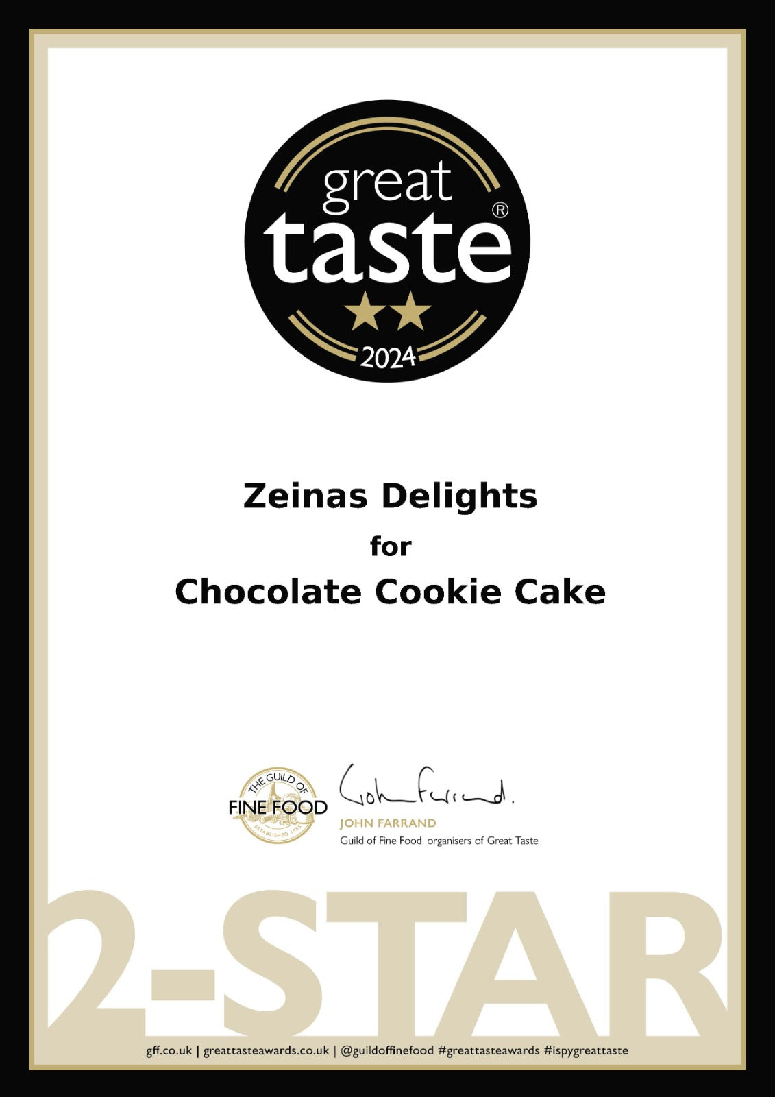 Award-winning chocolate cake (Great Taste 2024) composed of moist and rich chocolate cake, filled and coated with our signature cream cheese chocolate frosting and crunchy triple chocolate chip cookies.
